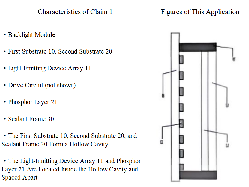 It can be seen from a reexamination panel’s re-understanding of application that the essential technical solution claimed in the application is an improvement on a conventional line light source and a point light source such as an array of light emitting devices, which uses an array of light emitting devices to emit photons to emit light and excite the phosphor layer to illuminate, so as to achieve uniform light effect, that is, even without the phosphor layer, the backlight module of the invention can emit light, and the function of phosphor layer is only improving the luminous effect and simplifying the structure by cooperating with the light-emitting device capable of emitting light. Briefly, the key principle of the application is that an array of light emitting devices 11 is a light source for light emission, and the phosphor layer 21 is for uniforming light.