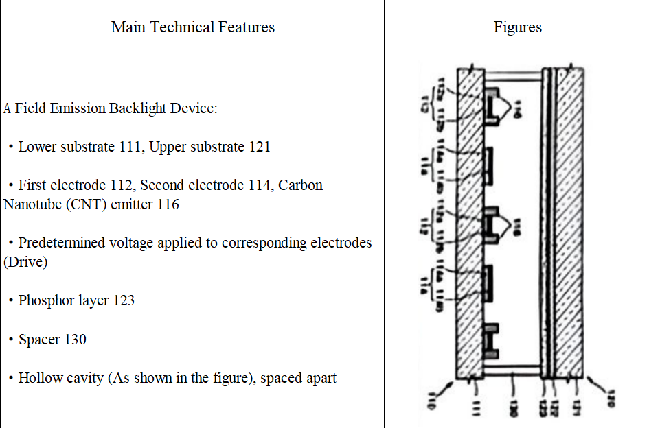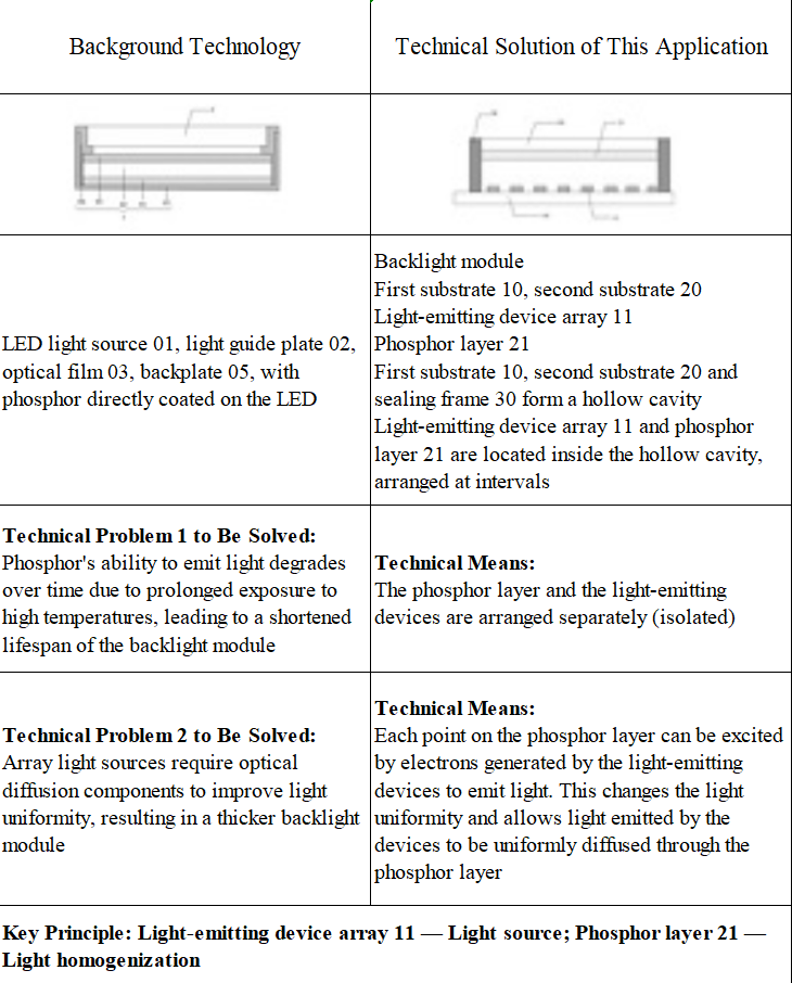 On the basis of this understanding, the reexamination panel asserts that: "The difference between claim 1 and the reference document 1 is that the phosphor layer of the application is coated on the second substrate, and the first substrate is provided with an array of light-emitting devices, and the driving circuit is to drive the light-emitting device to emit light, and the phosphor layer is spaced apart from the array of light-emitting devices, and the array of light emitting devices and the phosphor layer are located in the hollow cavity constituted by the first substrate, the second substrate and the sealant frame, and are spaced apart.” That is, reference document 1 does not disclose the phosphor layer and its corresponding arrangement of the application. Thereby, it is considered that the person skilled in the art has no motivation to change the principle of the field emission backlight of the reference document 1 and replace the light-emitting mechanism of the reference document 1 with the light-emitting structure of the application. That is, those skilled in the art have no motivation to obtain the technical solution involved in the application by combining other the prior technical means with the reference document 1 as starting point.