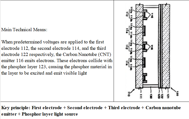 As is fully understood from the reference document 1, the fluorescent layer 123 in the reference document 1 is a constituent part of the light emitting devices, which cooperates with the first electrodes 112, the second electrodes 114, the third electrodes 122 and the carbon nanotubes (CNT) emitters 116 to illuminate, that is to say, they constitute the light source in the technical solution of the reference document 1.