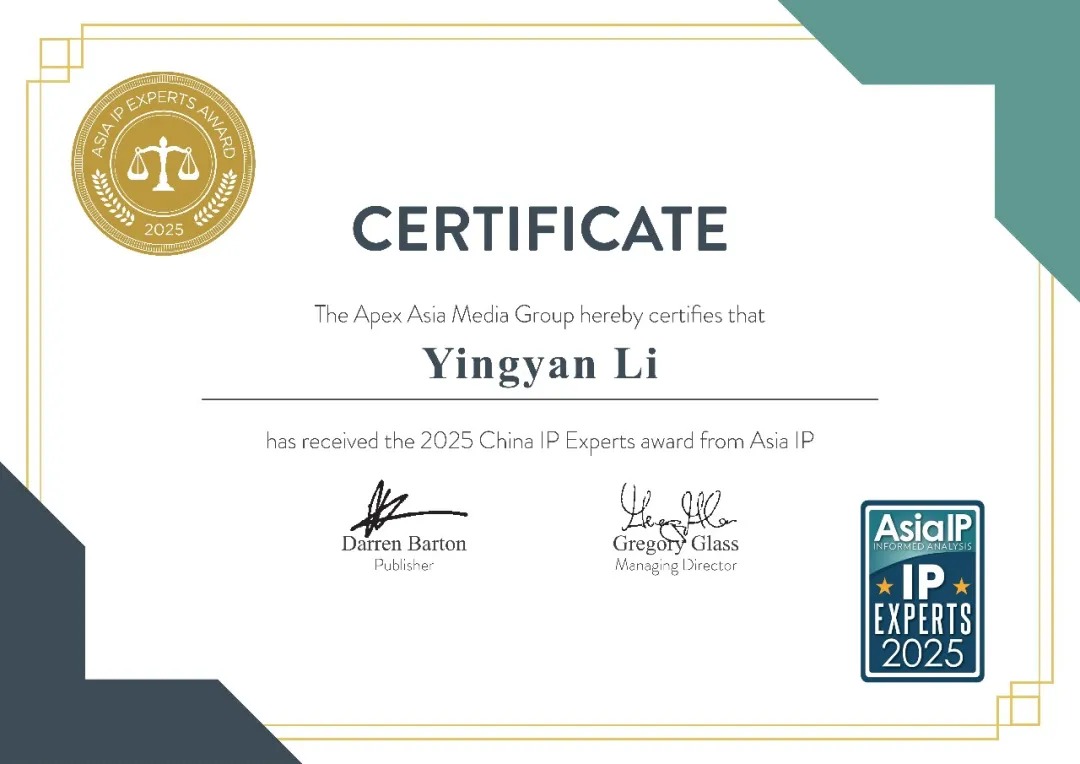 Good news! The internationally authoritative intellectual property journal Asia IP has announced the results of its 2025 Top 100 China IP Experts selection. Director Li Yingyan of LI & N IP has been honored with this distinction and awarded the "2025 China IP Expert Award"!